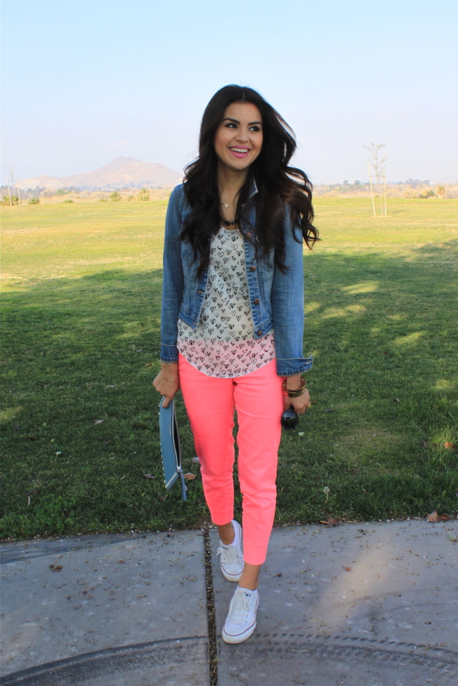 Today, I am sharing an unusual combination- trousers and sneakers. This outfit reminds me of the guy at prom that wears a tuxedo and sneakers- it just works! The juxtaposition of the casual sneakers and top and the dressiness of the pants is all pulled together with the jean jacket. I wore this outfit last week when I visited the Griffith observatory. I wanted an outfit that was casual yet girly. If you have not visited the planetarium you must put it on your 'to do list'. The view of LA is amazing! At night the city looks like a blanket of sparkling stars. I also love the shows in dome theater -it feels like you are actually traveling to space! The visit is totally worth sitting in traffic to get up the mountain!