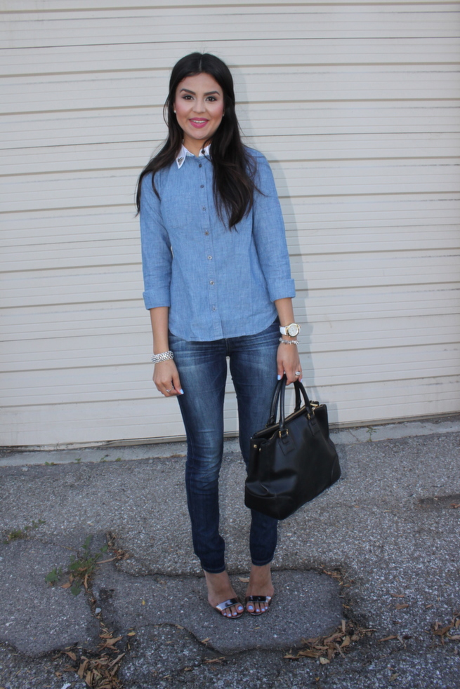 Today I am sharing one of my favorite denim on denim looks. Denim is my go to ... everyday! A great pair of jeans is ridiculously hard to find. So when I find a pair I love, I wear it like every other day ( not kidding) . I tend to live in the pieces I love because they become comforting (like a great pair of fuzzy socks on a cold night ) . I really love this pair because it is incredibly soft, stretchy, and it's the perfect wash! I'm also swooooning over this top because of the contrasting collar and the small touches of jewels ( cuteness! right?! ) . Denim on denim ... all I have to say about this is - Perfect combo!