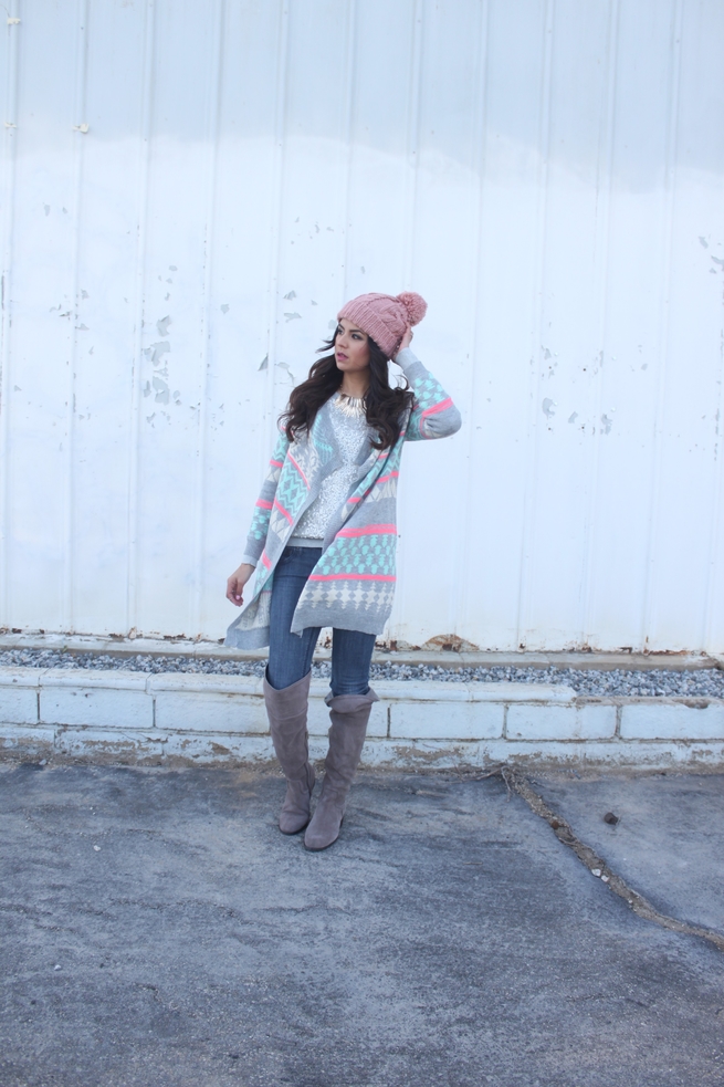 Cardigan- Lucy & Lila (other colors available) | Sweater- Express | Boots- Vince Camuto | Necklace- via Rocksbox c/o | Hat- Windsor |