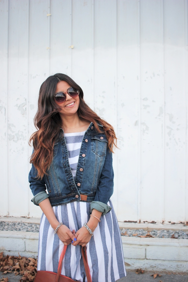 Today's look incorporates two of my favorite classics: stripes and denim. I just love this combination because it can be so versatile. I love to have a denim jacket on hand because they pair so well with almost anything, especially with dresses.