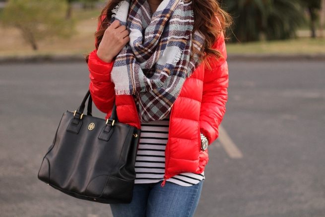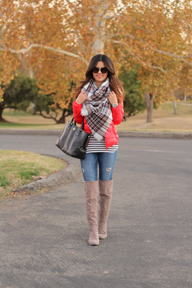 Puffer Jacket- old, similar here | Jeans- Paige Denim | Scarf- SheIn c/o | Boots- Vince Camuto ( available here and similar here and here) | Bag- Tory Burch | Watch- Michael Kors | Bracelets- The Peach Box c/o ; Jane Stone Jewelry c/o (in thin gold)