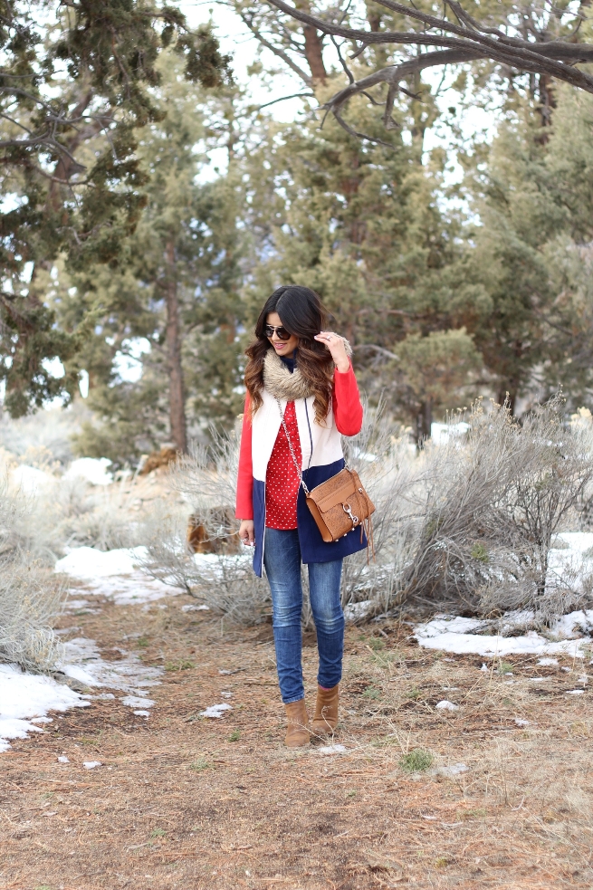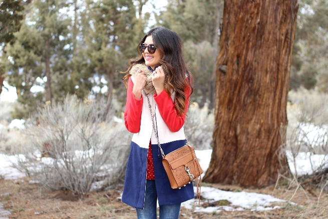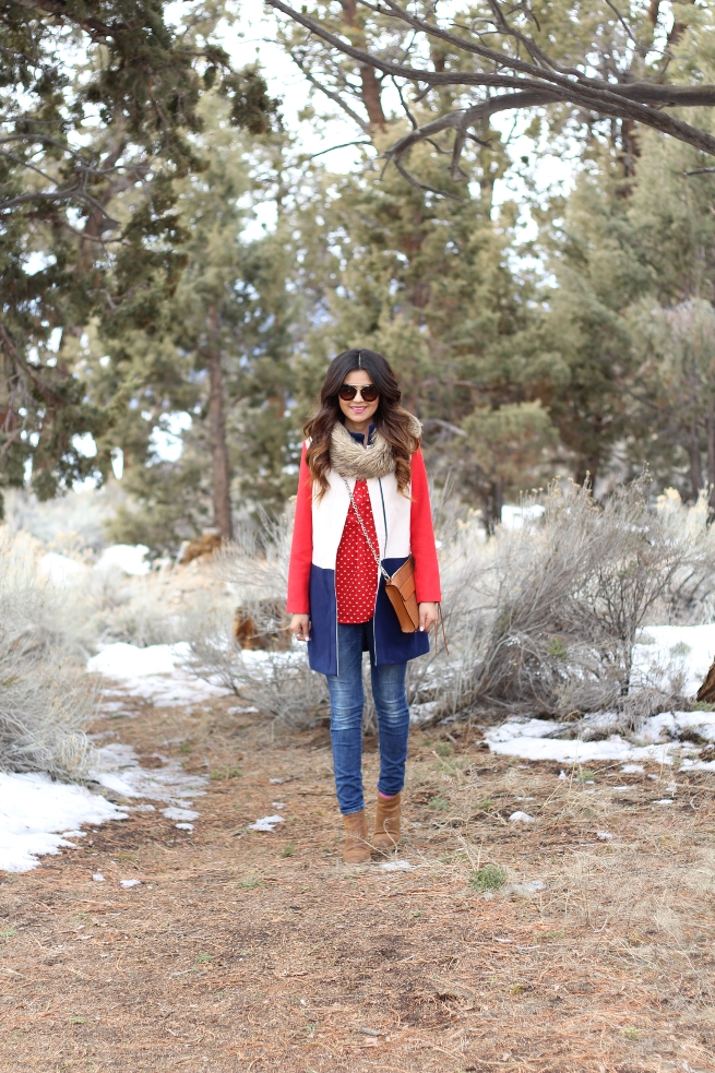 So today, I am sharing an outfit that is Valentine's Day inspired. This coat is total perfection. The colors are such a pretty colorblock combination! This coat literally could be thrown over many Valentine's Day outfits and be the perfect finishing touch. Today's look is more casual, paired with jeans and a hart print blouse. This Valentines day inspired look is my way of tip toeing into the month of V-Day!
