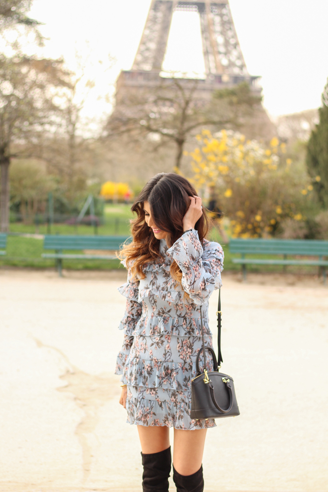 When we were there, it was a bit cold. So this long sleeve dress and over the knee boots were perfect. I also fell in love with all the ruffles and the cute floral print. It's funny how things become memories- and everytime I look at this dress in my closet I remember all the shennaningans of this Spring day in Paris.