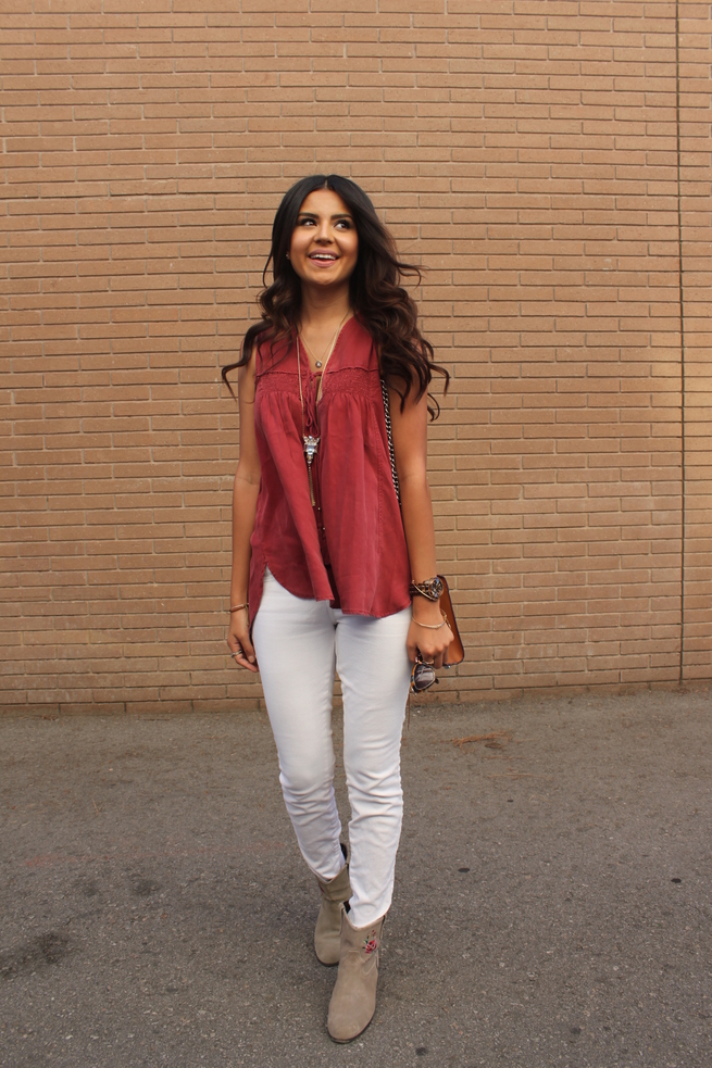 Today I am teaming up with Velvet Heart to share a casual look that can easily transition into Fall. As much as I try to fight it, summer is slowly coming to an end. And even though it is still hot outside, Fall fashion is slowly creeping in. Don't get me wrong, I love Summer (mainly the idea of summer vaca mode haha) but I love prefer Fall fashion. I am currently in love with this rich brick color! It is definitely a must have in your wardrobe. I am also crushing on dark plums, and fuchsia colors. I feel like these are the perfect colors to transition from Summer to Fall.