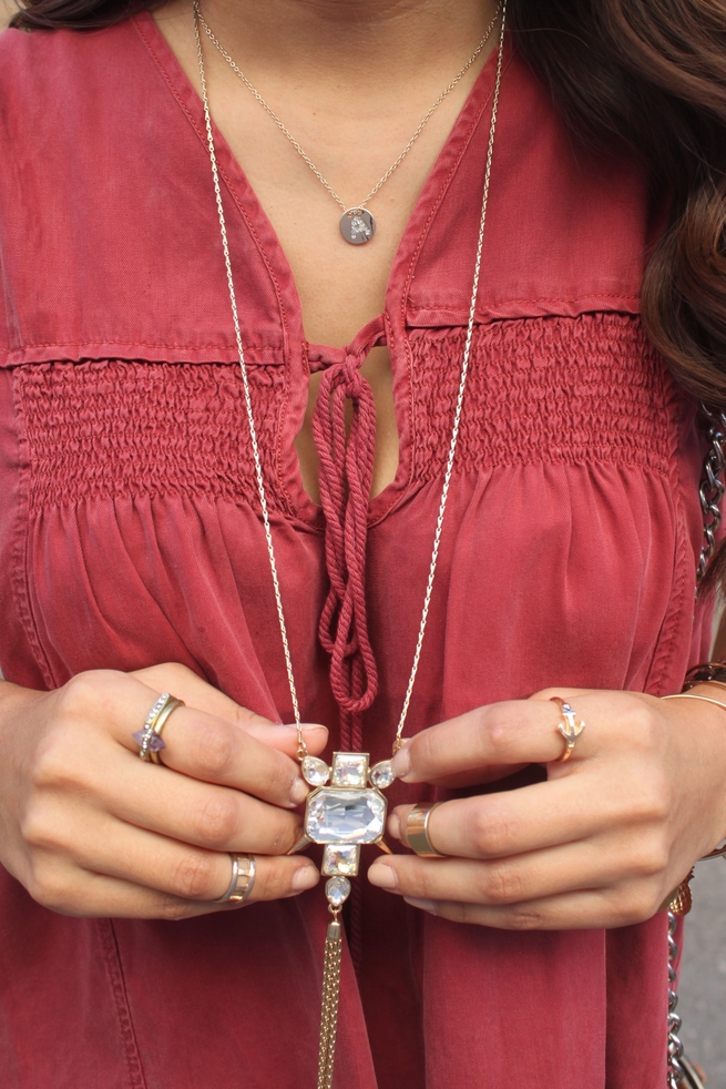 Top- Velvet Heart c/o | Jeans- GUESS ( love these) | Sunnies- Betsey Johnson | Necklaces- Itchelita Jewelry c/o; Ayana Designs c/o | Bracelets- Itchelita Jewelry c/o; Gigglosophy c/o | Rings- Chloe & Isabel c/o; Itchelita Jewelry| Watch- Michael Kors (old, similar here) | Bag- Rebecca Minkoff (old, similar here)| Booties- Betsey Johnson (old, similar here)|