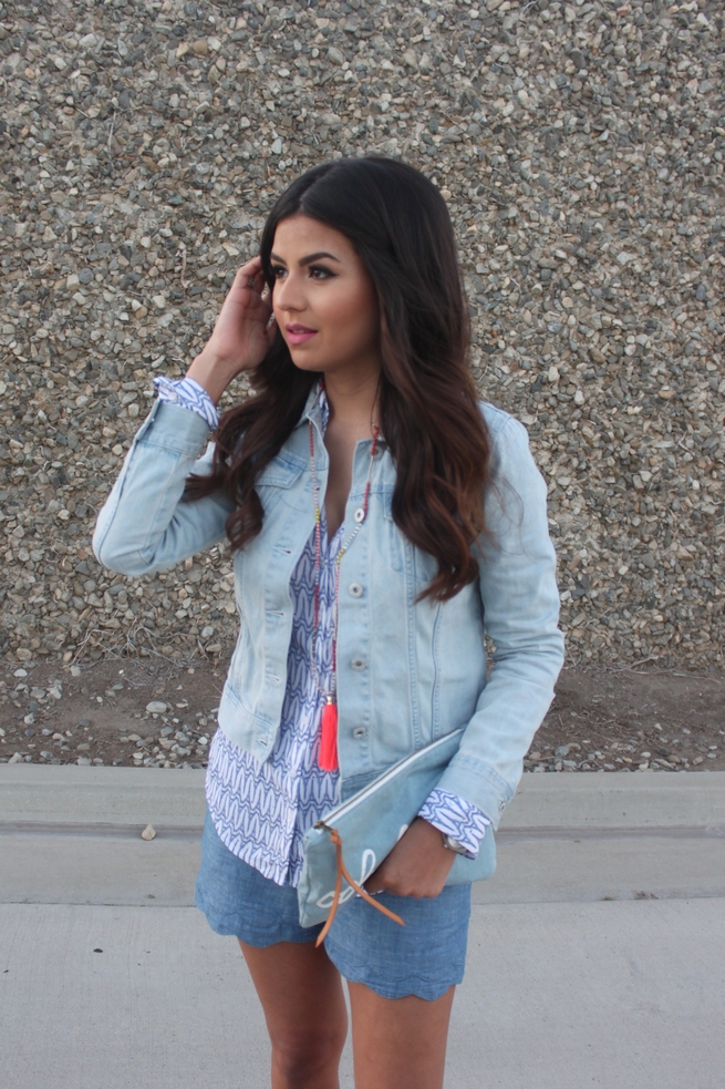 Top- Express (sleeveless version here) | Shorts- Loft (identical here) | Jacket- Banana Republic (similar here) | Wedges- Vince (identical here, love these) | Clutch- Loft (similar here) | Necklace- Express (similar here, here)