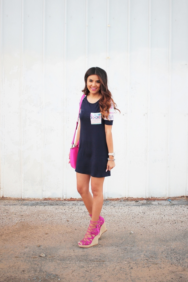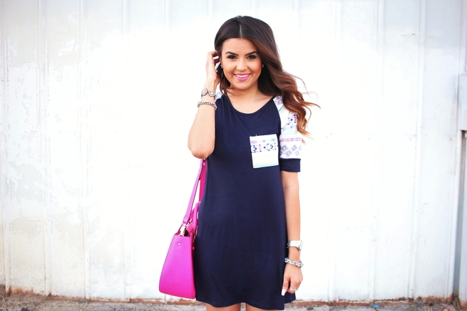 Today's outfit is all about the details...sleeve details. This tunic reminds me of a girly version of a baseball sleeve shirt ( don't you think)? I love the contrasting colorful print of the sleeves against the simple silhouette. I, also, love that it can be worn as a dress or as a top.