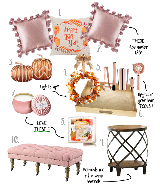 1. Happy Fall Pillow | 2. Pink Pom Pom Pillow | 3. Glitter Pumpkins | 4. Fall Light Up Wreath | 5. Rose Gold Bar Tools | 6. Gold Serving Tray | 7. Prosecco Rose Candle | 8. Pumpkin Latte Candle | 9. Round End Table | 10. Pink Tuffed Bench