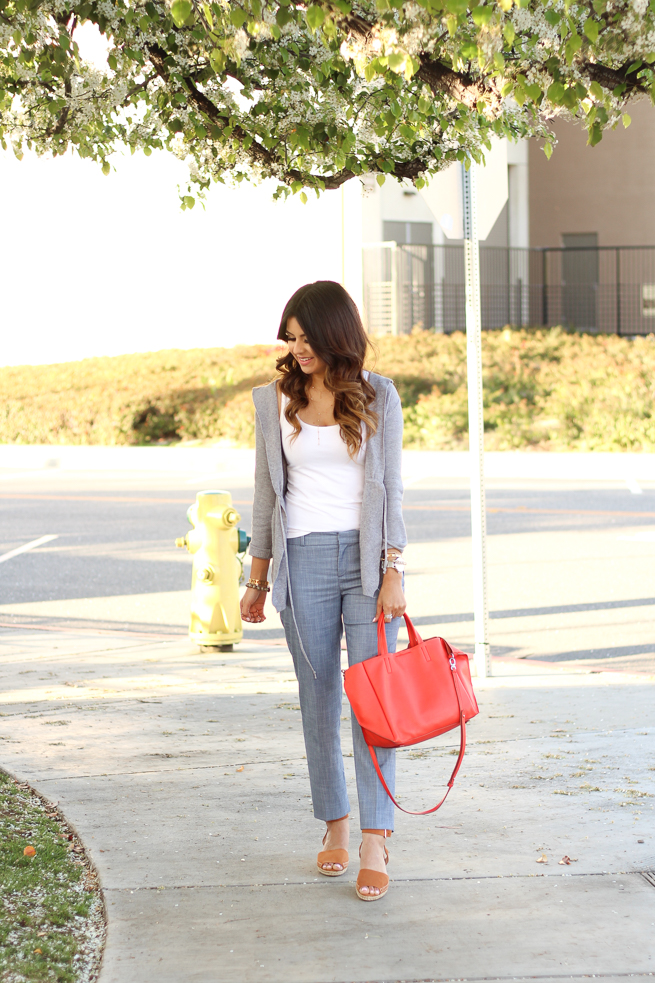 Five pieces that are essential, in my opinion are: classic trousers, a basic tee, a colorful tote, a light sweater, and a pair of comfortable shoes. These pieces are so easily interchangeable and easily create Spring ready outfits. I adore the fabric of these pants since it looks like chambray. However, the silhouette is put polished and can is so functional. I paired them with a simple tee and light sweater and this tote for a pop of color. This bag is a soft light weight leather that has a classic slouchy design that I can’t wait to wear for the rest of Spring. However, during the week, to dress this outfit up all I need it to put on a blazer and a polished pair of heel and I am good to go- simple.