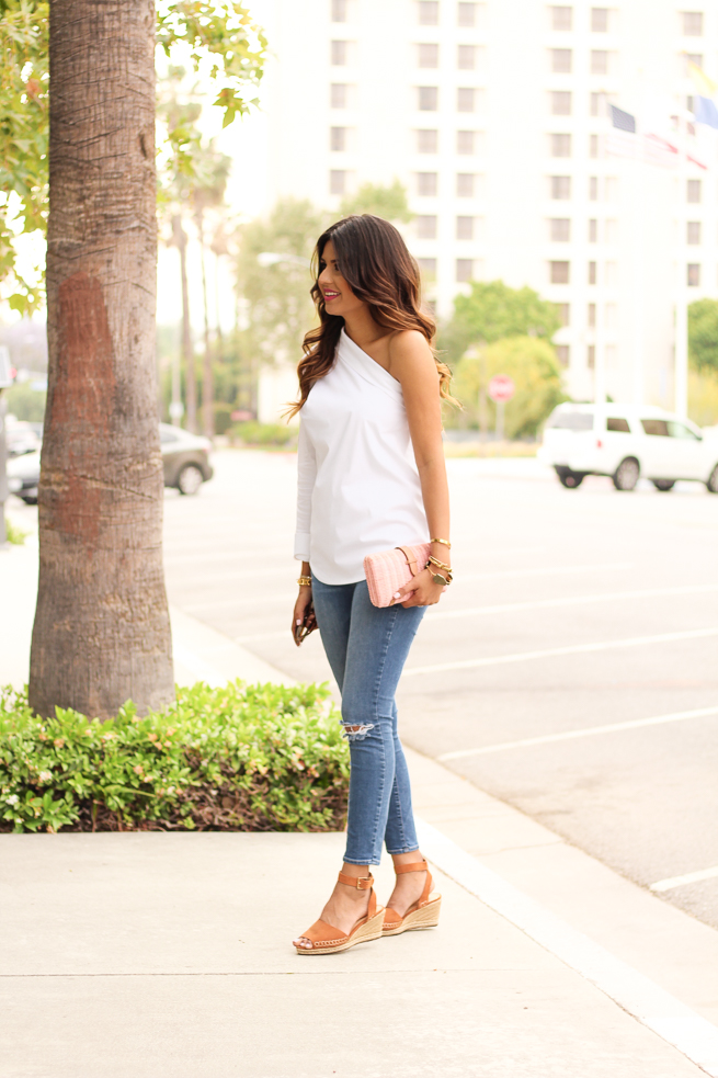 One Sleeve White Top- Banana Republic c/o | Jeans- Paige | Espadrille Wedges- Schutz | Pink Straw Clutch- J.Crew |