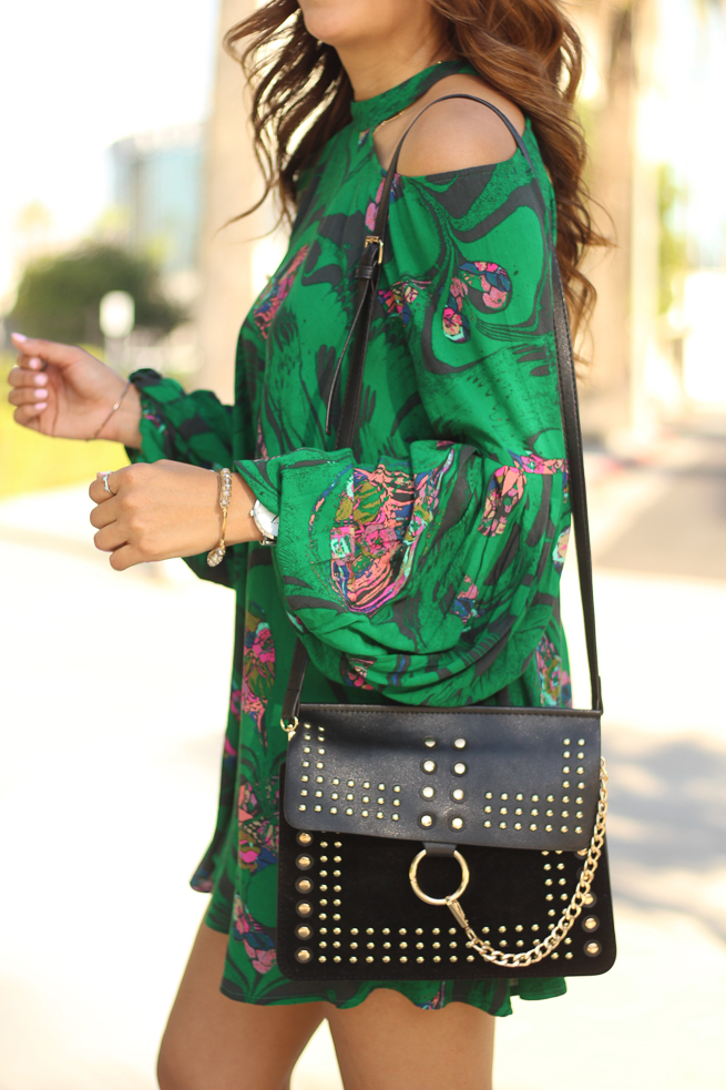 Now about today’s blog post. I am sharing this cute green tunic that I instantly fell in love with because of the beautiful green color. In my opinion FreePeople makes some of the cutest prints. However, sometimes I struggle to find practicality in some pieces that have unique silhouettes (or too short in length). This tunic is actually the perfect length, so it worked as a dress for me (as reference, I am 5’8”). I bought it because it will also be a great transitioning piece for Fall. It is too warm in SoCal to wear pants but in the Fall I will be great with legging and booties! Today I am sharing how I wore it with my favorite black espadrilles and this studded crossbody bag. These espadrilles have been the best investment. I hesitated on getting them in the Spring because $160 seems like too much for espadrilles. But, I am so glad I pulled the trigger!! Also, I feel like they make my legs look longer!