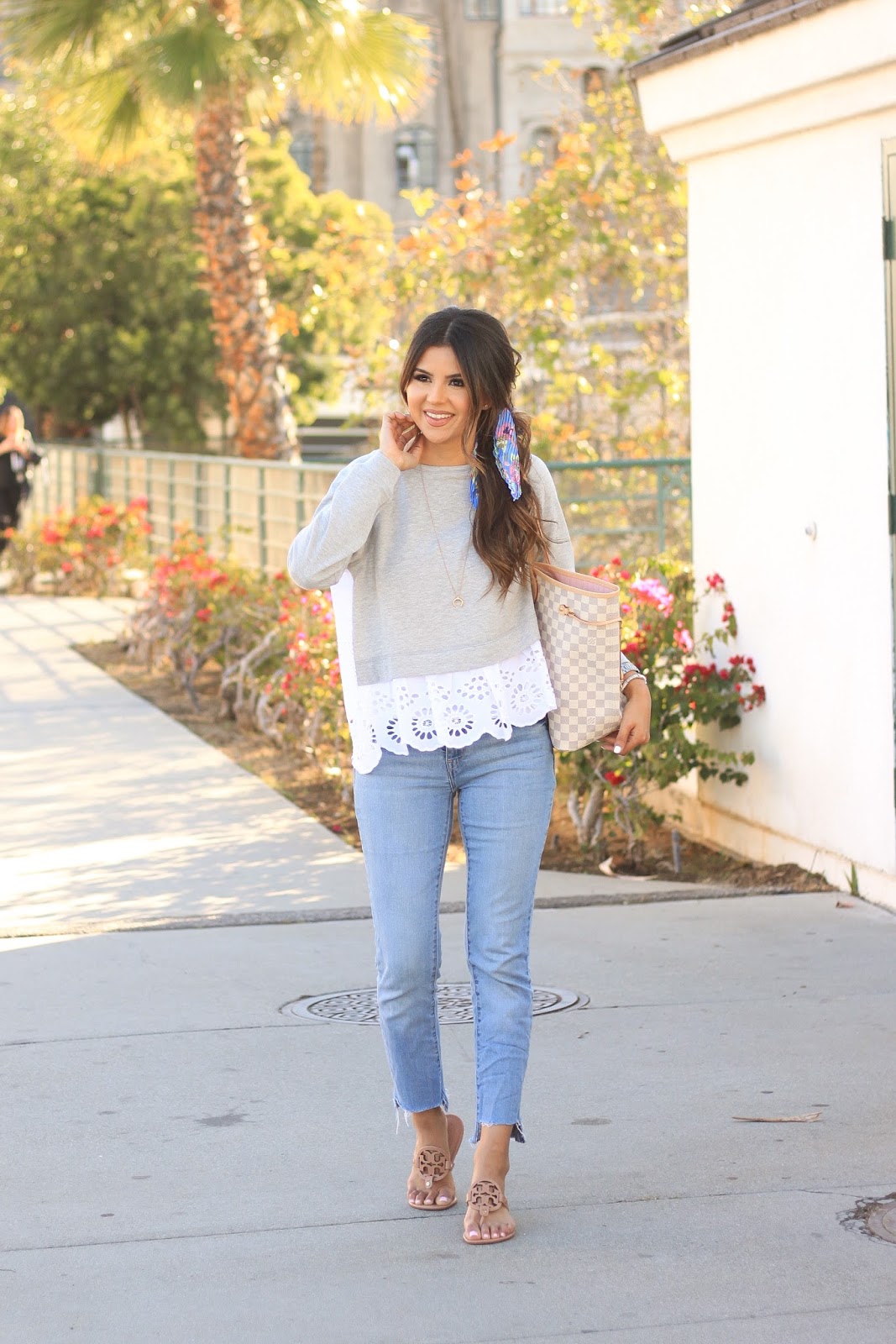 I was in a little bit of a weather funk and was waiting for the weather to warm up to wear some new things for Spring. So, today I wanted to share this cute and casual Spring outfit with some of my favorite pieces as of lately. There are two trends I have been loving lately- eyelet and cute hair scarves. So don’t be surprised if you keep seeing those trends pop up on my Instagram and blog.