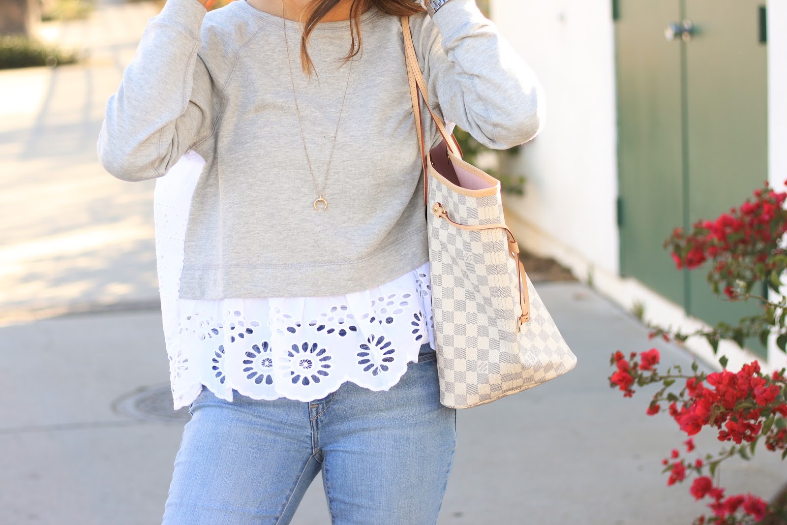 For Spring light layers are key and this adorable sweater is a must have. I love that it’s such a feminine sweatshirt with the most darling eyelet back. I actually snagged this grey eyelet sweatshirt and scarf at an amazing price- not one bit of buyer’s guilt here! This sweater is such a cute dupe for more expensive styles like this one and this one. I was considering getting some of the other styles but stumbled across this one that is under $25! Also, this scarf just went on sale and is under $7!